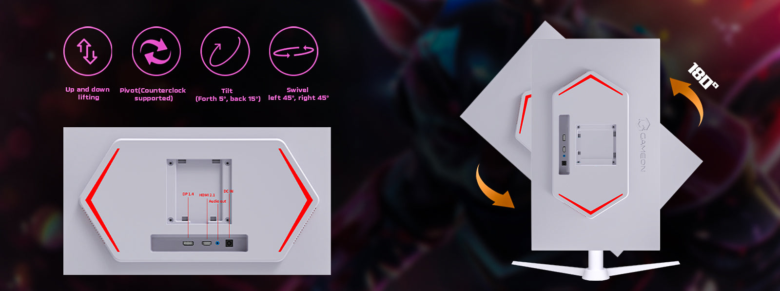 - Connectivity: HDMI 2.1, DP1.4, audio out, and DC power input with back cable support.