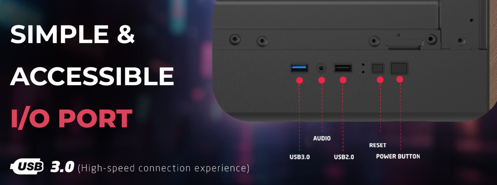 Equipped with USB 3.0, USB 2.0, and HD Audio, the top-mounted I/O hub ensures quick access and effortless connectivity for all your essential peripherals.