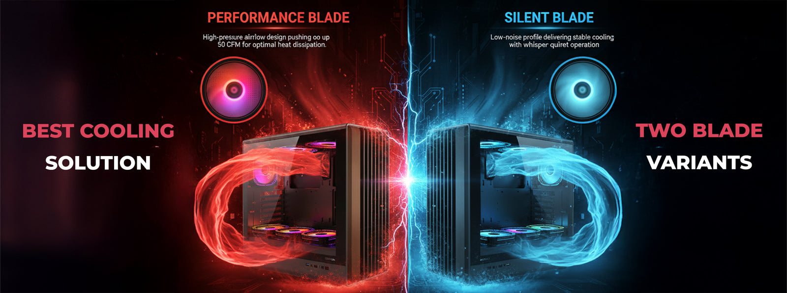 Performance Blade: High-pressure airflow design pushing up to 50 CFM for optimal heat dissipation. Silent Blade: Low-noise profile delivering stable cooling with whisper-quiet operation.
