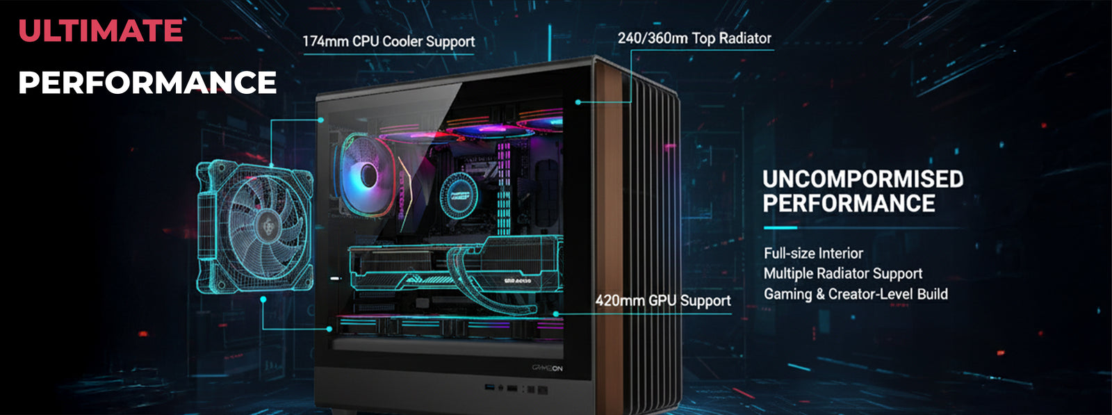 Full-size interior supports a 174mm CPU cooler, 420mm GPU, and multiple radiators including 240/360mm top water cooling, ensuring uncompromised gaming and creator-level performance.