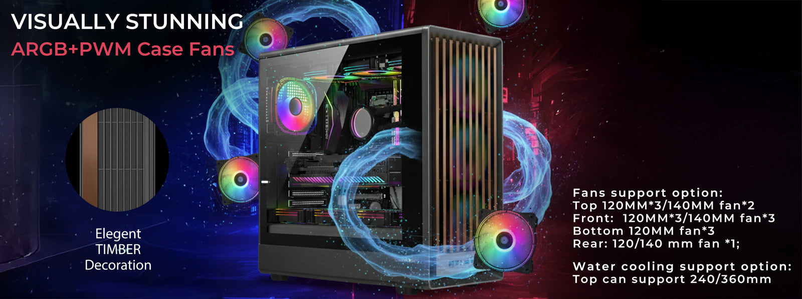 Pre-installed with 7 × 120mm ARGB+PWM fans delivering 45–50 CFM airflow and smooth lighting transitions, the case provides a vibrant, polished showcase from every angle.