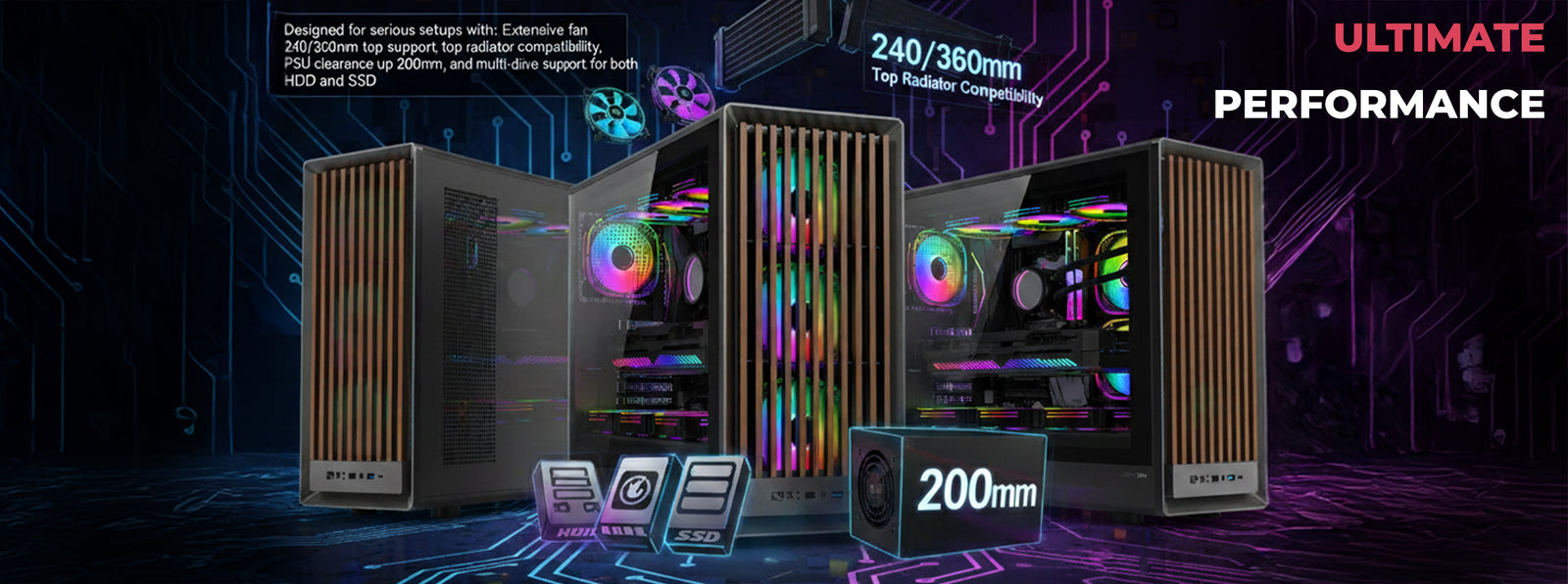 Designed for serious setups with extensive fan support, 240/360mm top radiator compatibility, PSU clearance up to 200mm, and multi-drive support for both HDD and SSD.