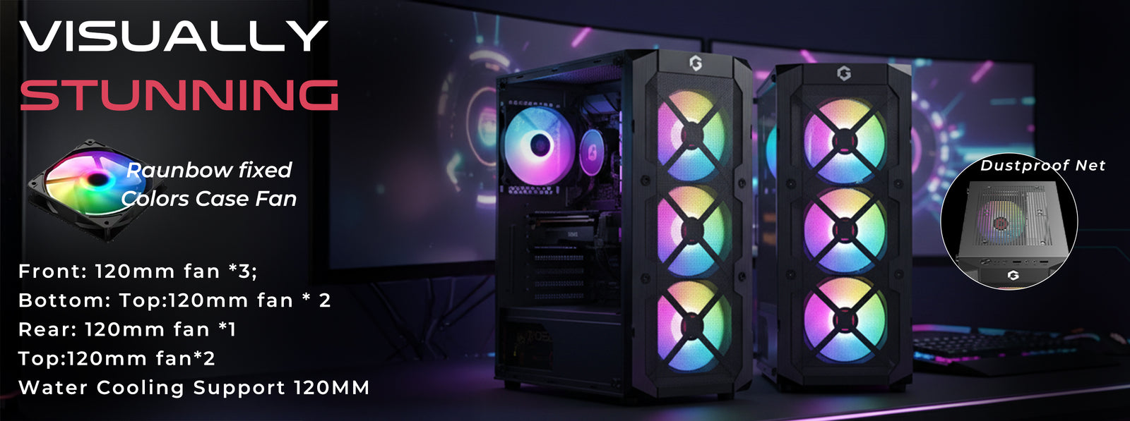 Designed to maintain optimal airflow with: • Front: 3×120mm Fans • Top: 2×120mm Fans • Rear: 1×120mm Fan • Bottom: 2×120mm Fans The dual-blade fan design enhances both air pressure and airflow, keeping temperatures low even during heavy loads. Supports CPU coolers up to 155mm and GPUs up to 290mm.