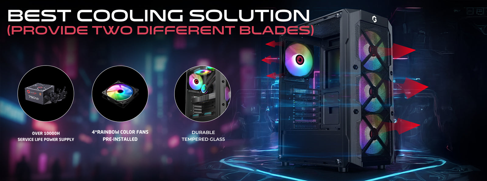 Built for convenience, the case comes with 4× 120mm LED luminous fans pre-installed, delivering up to 45 CFM airflow for reliable cooling straight out of the box. Supports power supplies up to 160mm, ensuring easy installation and clean cable management.