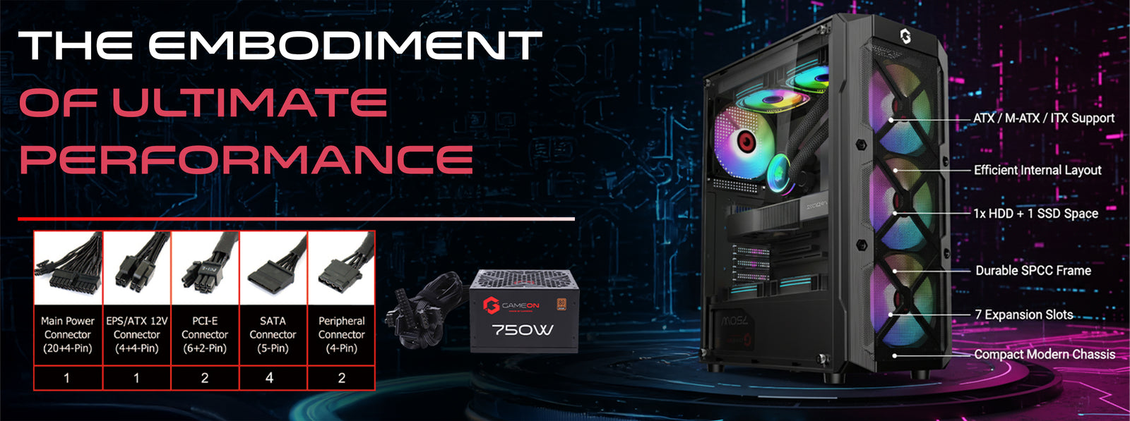 Engineered for versatile builds with ATX / M-ATX / ITX motherboard support, efficient internal layout, and space for 1× HDD + 1× SSD. A durable SPCC frame, 7 expansion slots, and compact dimensions ensure a high-performance setup within a clean and modern chassis.