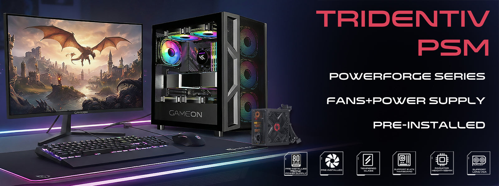 Built for serious builders, the TridentIV-M POWERFORGE Series combines a robust SPCC iron frame with stunning design, offering full compatibility with ATX, M-ATX, and ITX motherboards. With a pre-installed 750W 80+ Bronze PSU and optimized component space, this chassis delivers a reliable, high-performance foundation for any modern gaming setup.