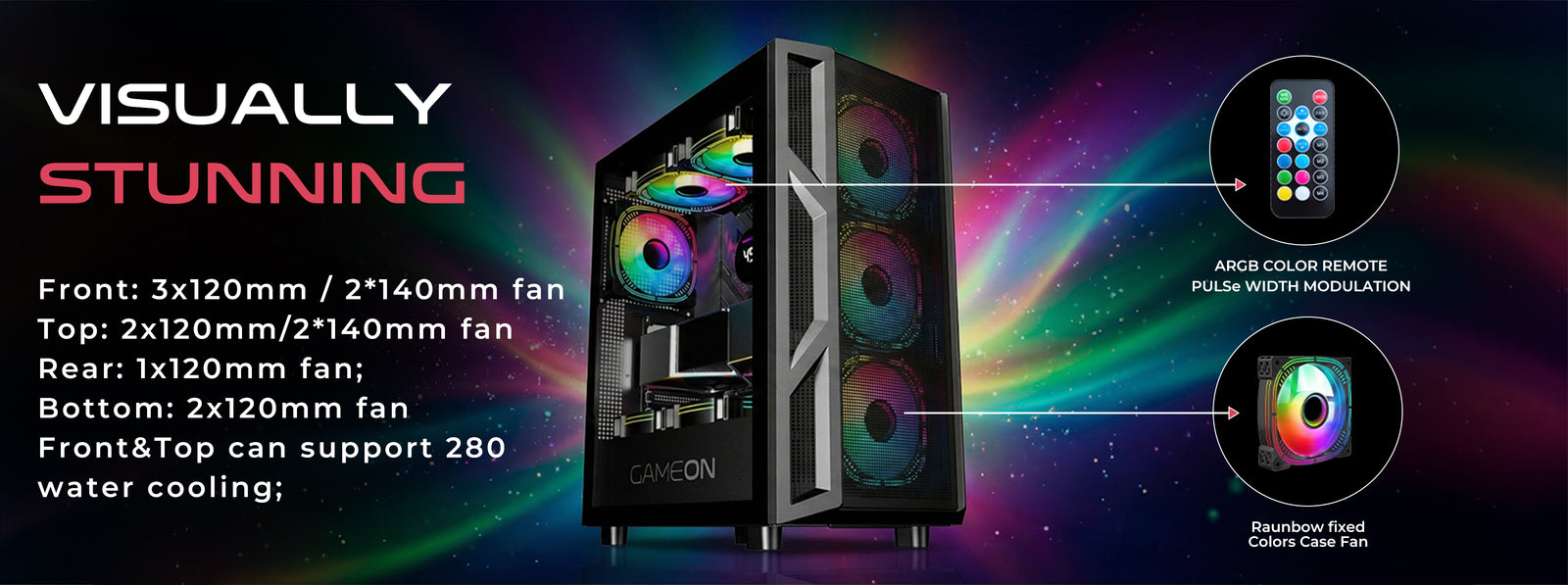 Illuminate your rig with four pre-installed 120mm ARGB+PWM fans producing brilliant rainbow effects. Enjoy vibrant lighting, smooth transitions, and balanced airflow for a captivating showcase through the tempered-glass side panel.